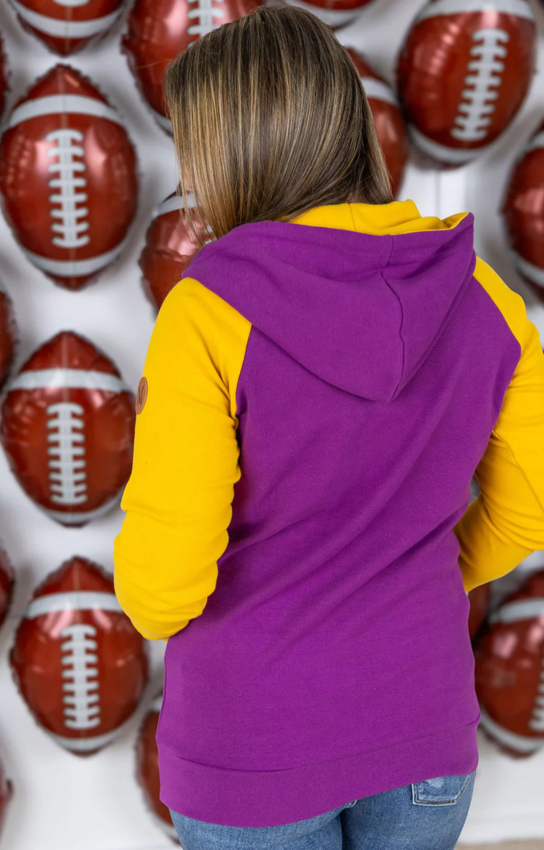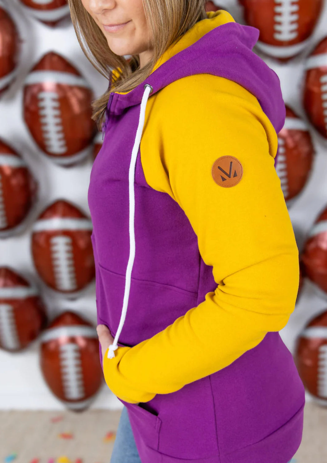 Stay stylish and comfortable on game days with our GameDay Halfzip Hoodie in Minnesota colors by Michelle Mae! This classic halfzip design features thumbholes, triple stretch fabric and a kangaroo pocket for added convenience. Perfect for football fans looking to stay warm and represent their team!