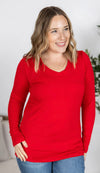 Add sophistication to your everyday attire with the Larissa Long Sleeve Top in red by Michelle Mae. This essential V-neck top blends timeless style with modern comfort, making it perfect for any occasion.